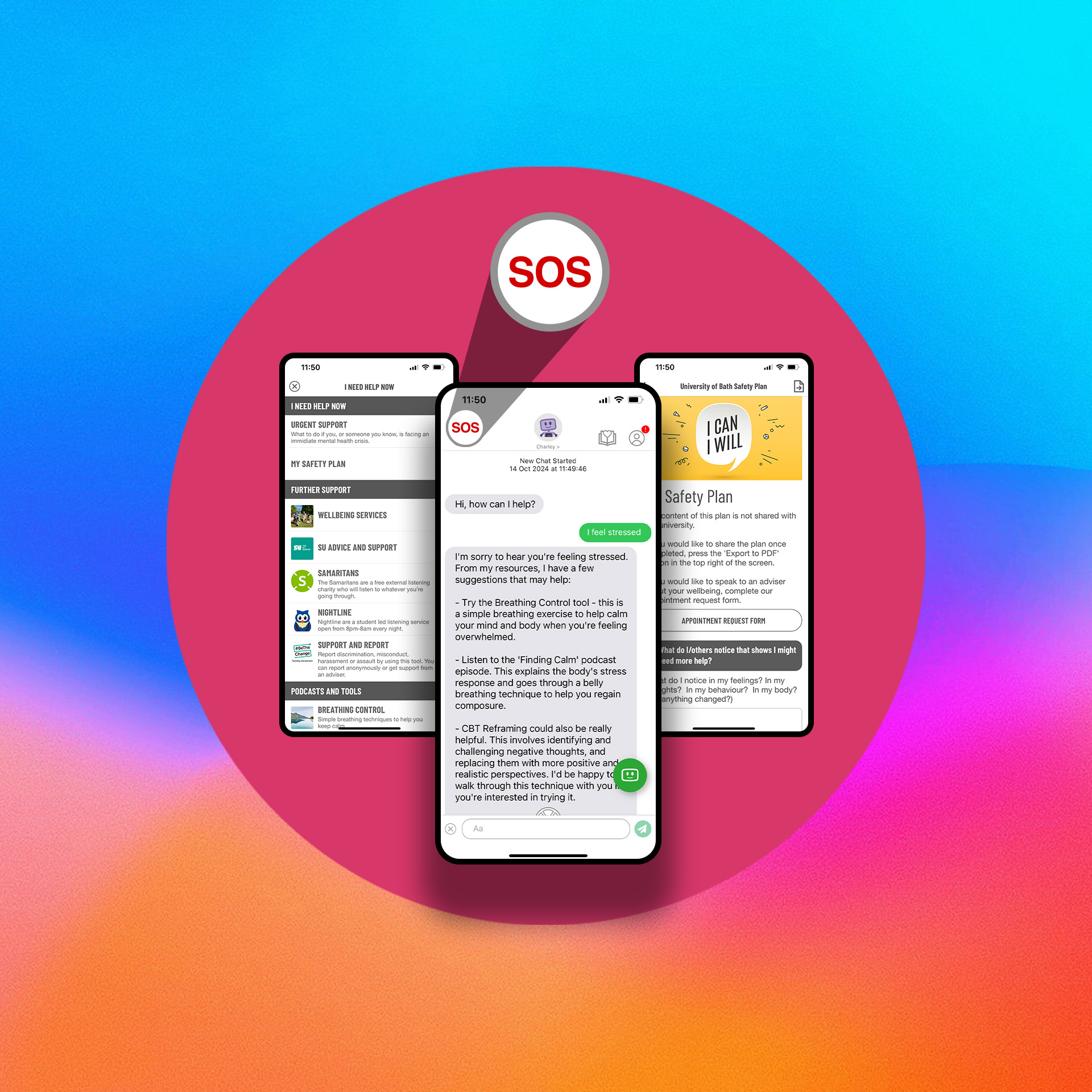 The SOS features provides instant access to crisis resources, breaking down barriers and destigmatising help-seeking behaviour.